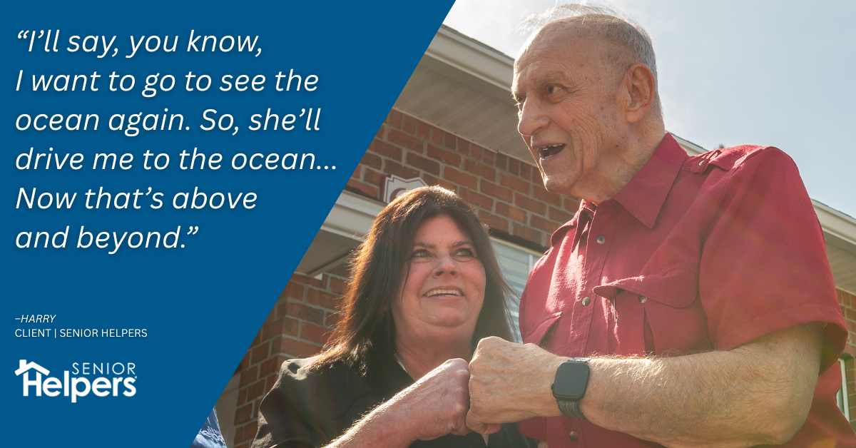 From help with daily tasks like laundry and changing the bed sheets, sharing a few laughs, to drives out to see the ocean, Harry’s home aid from Senior Helpers has made a real difference in his life. Her thoughtful, reliable support gave him the comfort of knowing he wasn’t alone—and that he was in good hands.