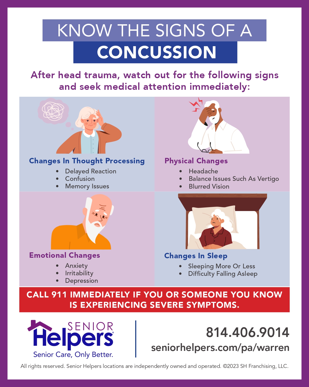 Signs and Symptoms of Concussions and Cellulitis Understand the signs and symptoms of concussions and cellulitis, to help yourself or an aging loved one in need!